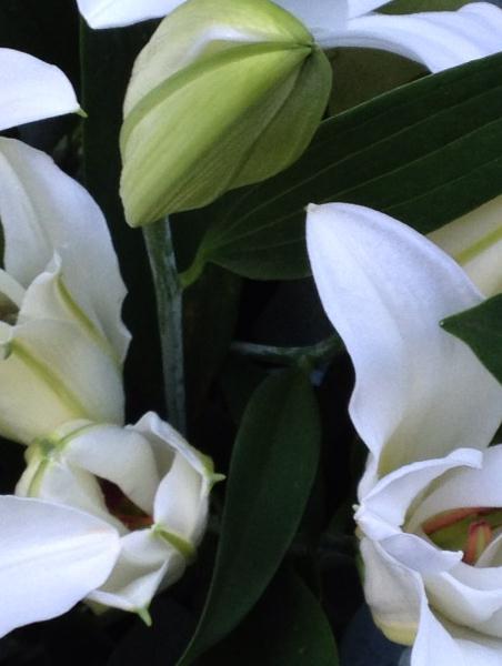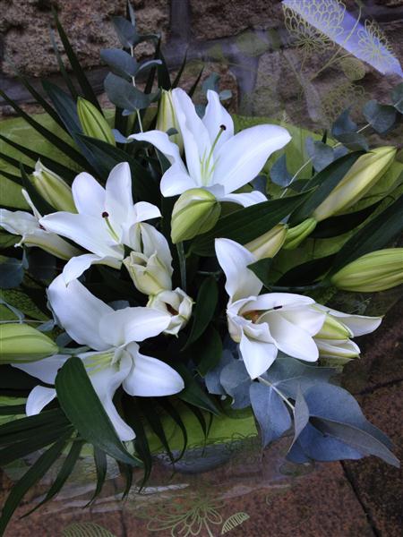 A simple, classic bouquet of oriental lilies and mixed foliages. These will be gift wrapped in eco-friendly cellophane with a raffia bow. Photo shows the standard priced design.